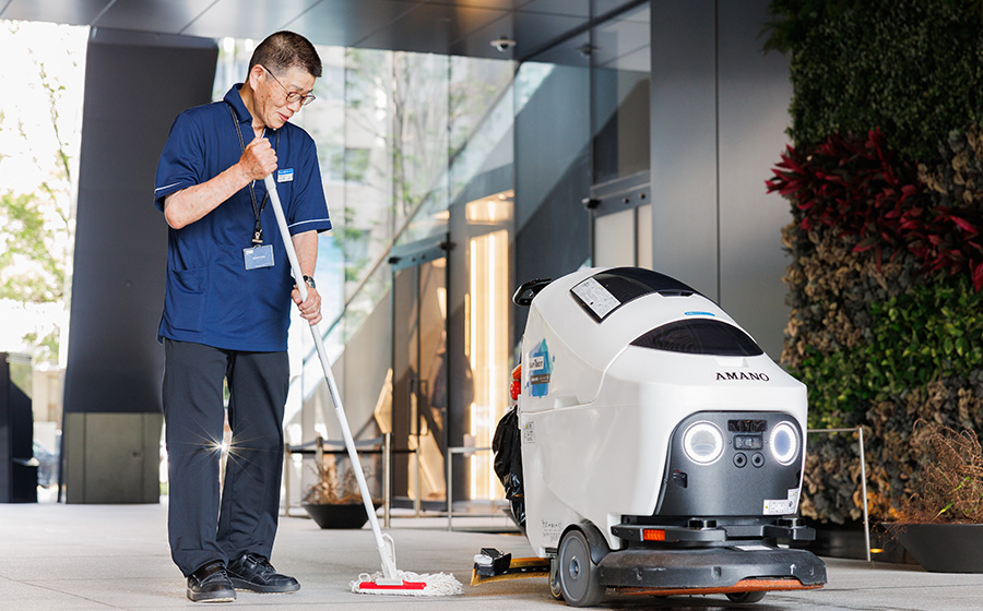 清掃員の作業負担を軽減するため、一部の現場では清掃ロボットを導入しています。