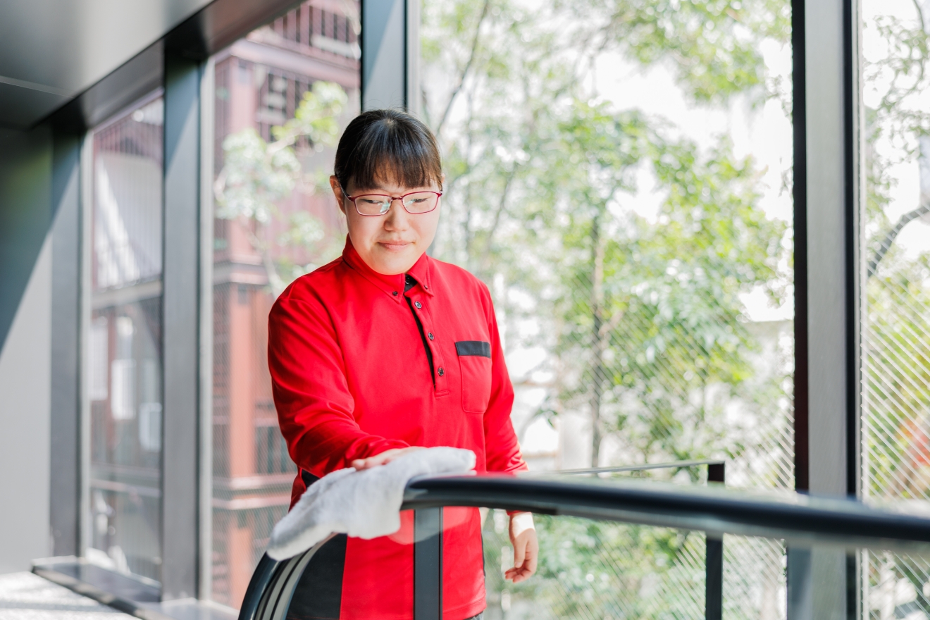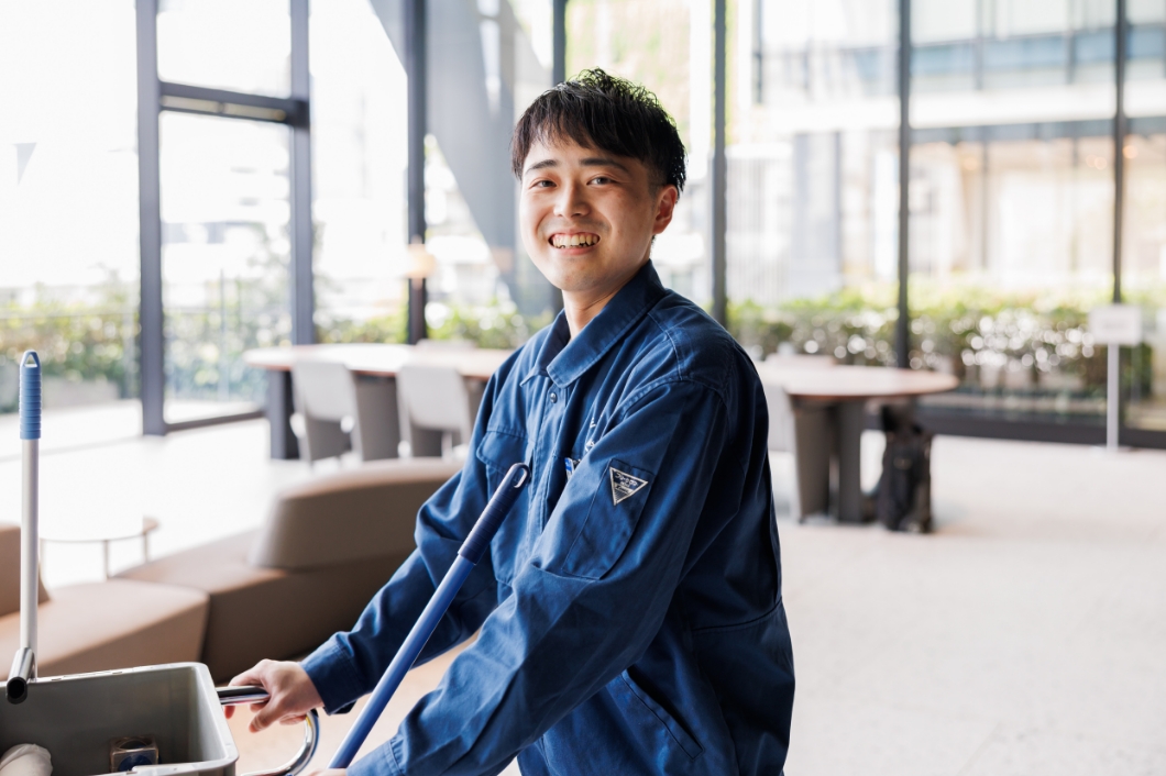 普段は清掃管理業務を担当していますが、欠員がでた現場があれば応援に行くことも。こうした多岐にわたる業務を通じて、施設のオーナー様や利用者に満足していただくお手伝いをしています。