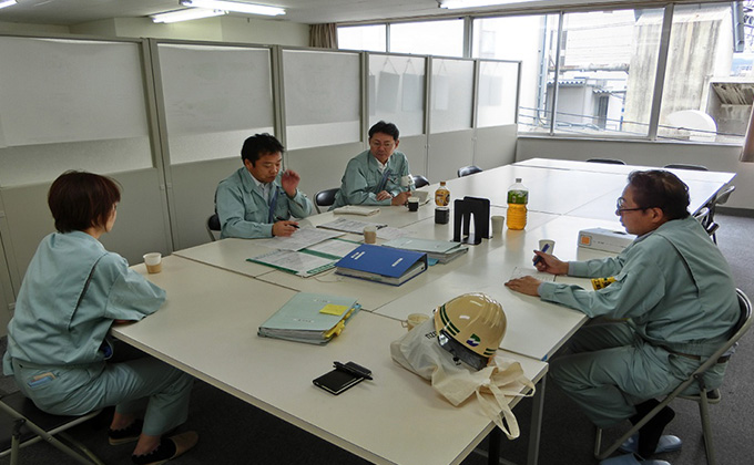 当日作業にかかわる全員で作業内容の確認人員配置、危険予知活動、リスクアセスメントの洗い出しを行い作業を開始します。